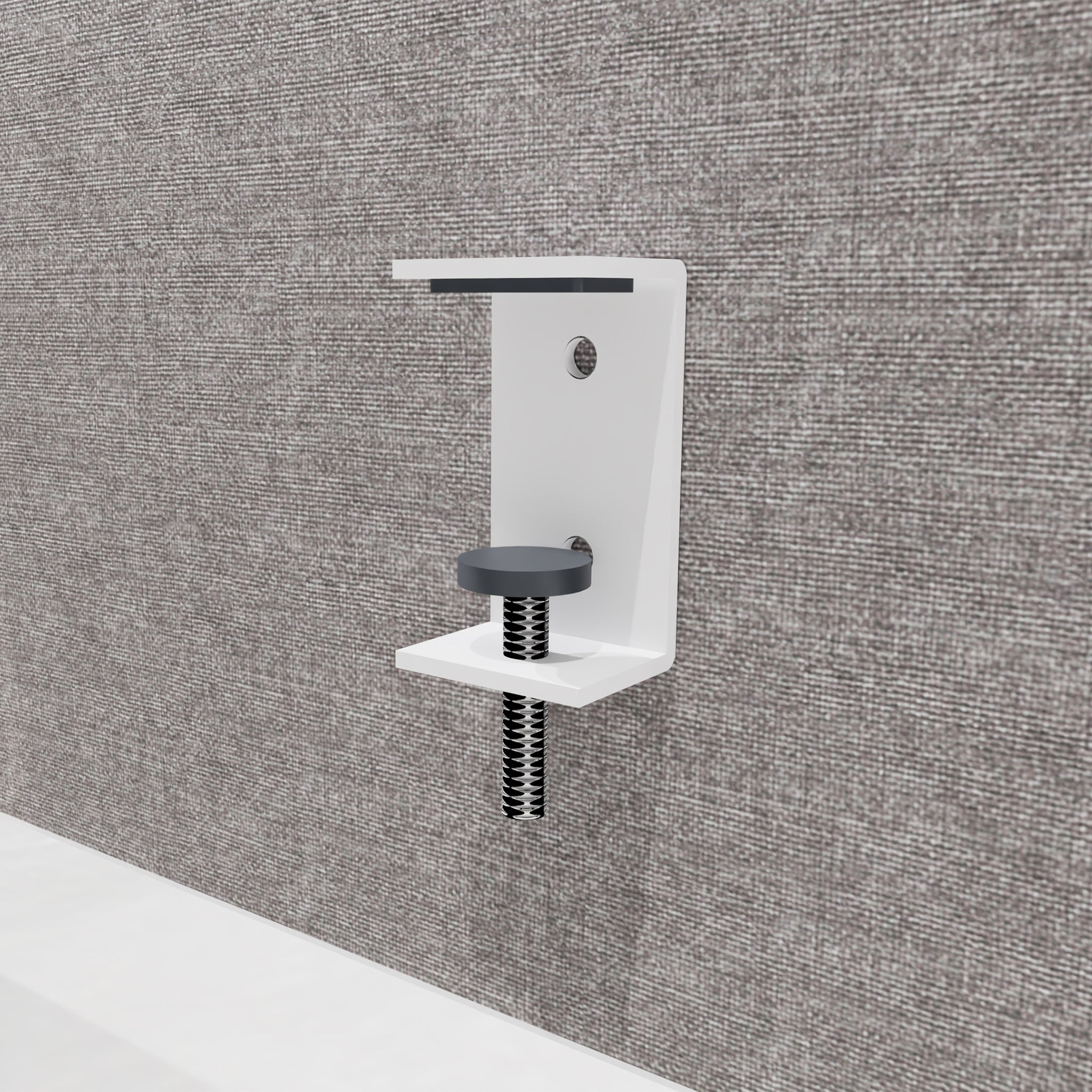 De akoestische voorzetwand rondom gestoffeerd 4cm dik wordt voor het bureau geklemd. Het paneel dient ook als schaamschot en is perfect voor enkele zit-sta werkplekken.